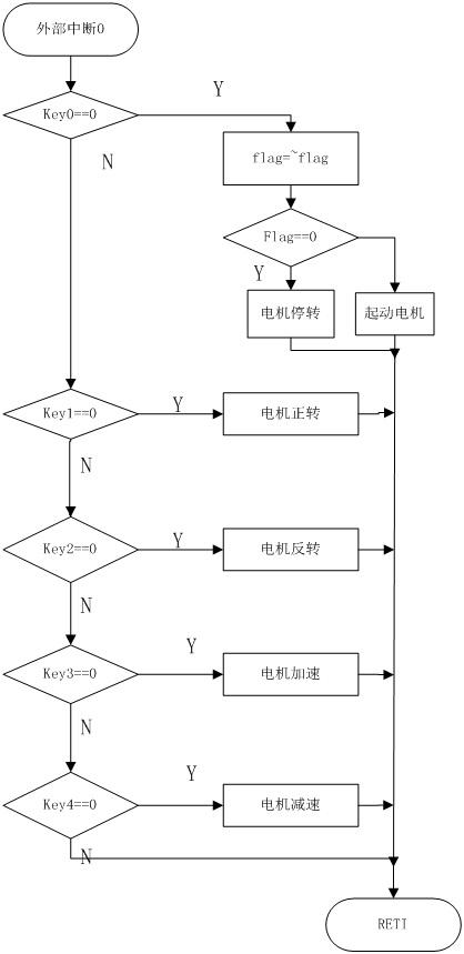 当发生外部中断时,单片机进入外部中断程序,开始扫描按键,先扫描KEY0按键,看是否按下了起/停键,如果按下了该键,则执行起/停程序;如果没有则判断KEY1键,看是否按下了该键,若果按下了,则执行正转程序;若果没有判断KEY2键,若该键按下,则执行反转程序;若没有则检测KEY3键是否按下,若按下,则执行加速程序;若没有则检测KEY4键,若该键按下,则执行减速程序,否则退出中断程序。按键显示程序流程图如图13所示。在这段中断程序中,扫描按键,并执行相应的指令。因为把按键扫描程序放到外部中断程序中,单片机只有在接收到外部中断的申请时,才去扫描按键,在无按键按下时,不必浪费时间去扫描按键,提高了CPU的效率。