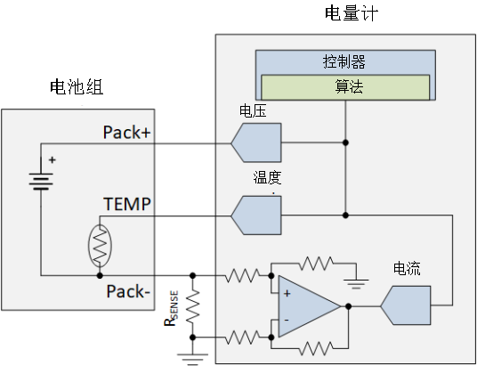 图1:带外部电流检测放大器和控制器测量的电量计