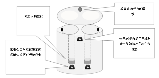 霍尔效应传感器能够很好地应用于检测充电盒盖和耳塞充电情况。鉴于磁铁已用来合上充电盒盖,因此,以霍尔效应开关的形式使用磁感测解决方案检测盖子显然是一种无需额外零件即可之际连接/断开蓝牙的解决方案。此外,将磁铁放进在耳塞,是一种能够检测充电盒内是否存在耳塞的从而有效充电方法。