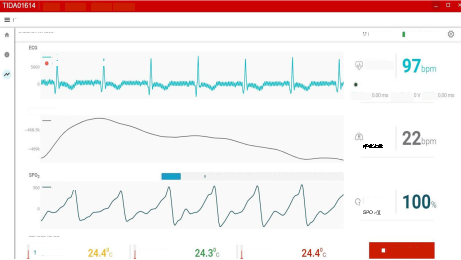 图2:显示ECG、PPG、呼吸、心率和皮肤温度的图形用户界面