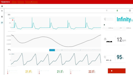 图形用户界面(GUI)以5秒的移动间隔显示采集到的波形,同时通过基本过滤来清除噪音,如由电源和照明造成的共模干扰等。图2显示的是PC上的ECG测量结果、呼吸和SpO2,以及每分钟的心率和呼吸次数(每分钟呼吸次数)、SpO2百分比与温度值。