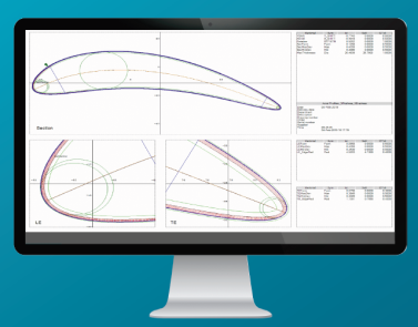 在一个检测周期内,接触式测量和非接触式测量各司其职,Precitec S3光学传感器用于高速测量叶型,而HP-S-X1C固定扫描测头用于精确检查榫头截面。利用专业的叶片检测模块QUINDOS Blade可以简化叶片前缘半径、弦切线、叶型厚度、叶型、叶根和平均外弧线的测量,提高检测效率。