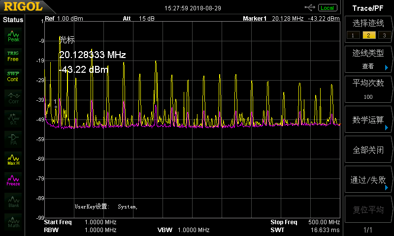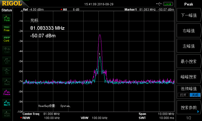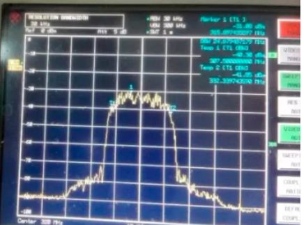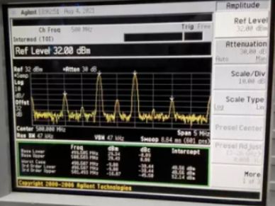 下图为信号交调失真测试图,通过mark-DELT标注功能可以测试信号与交调信号功率差(dB)