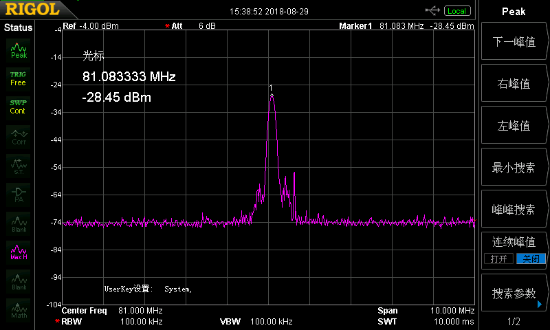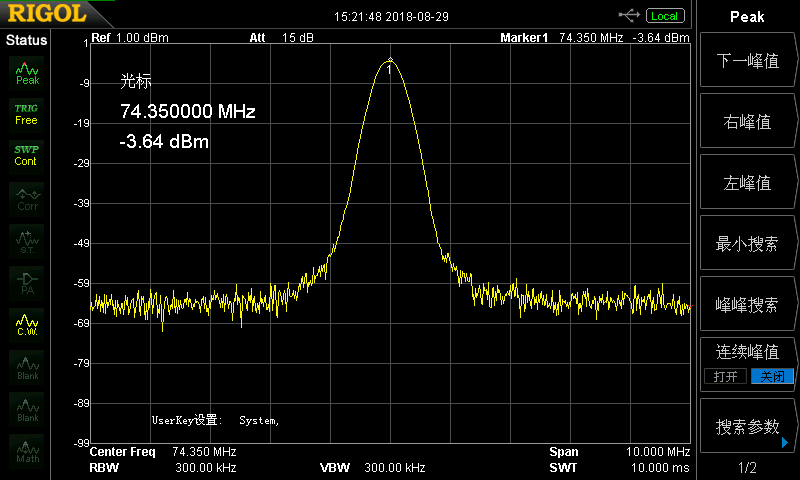 下图为信号源发出一单载波信号后,频谱仪的显示,通过MARK——PEAK,操作可以看到信号频率为74.35MHz,功率为3.64dBm。