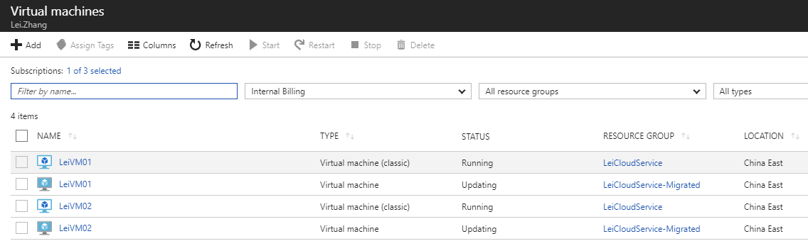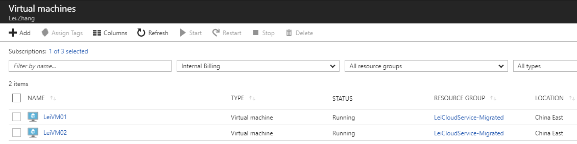 已经创建了Azure Virtual Network,则我们在迁移这个Virtual Network之后,就可以把该VNet里面的所有VM (LeiVM01和LeiVM02) 都迁移到ARM模式。