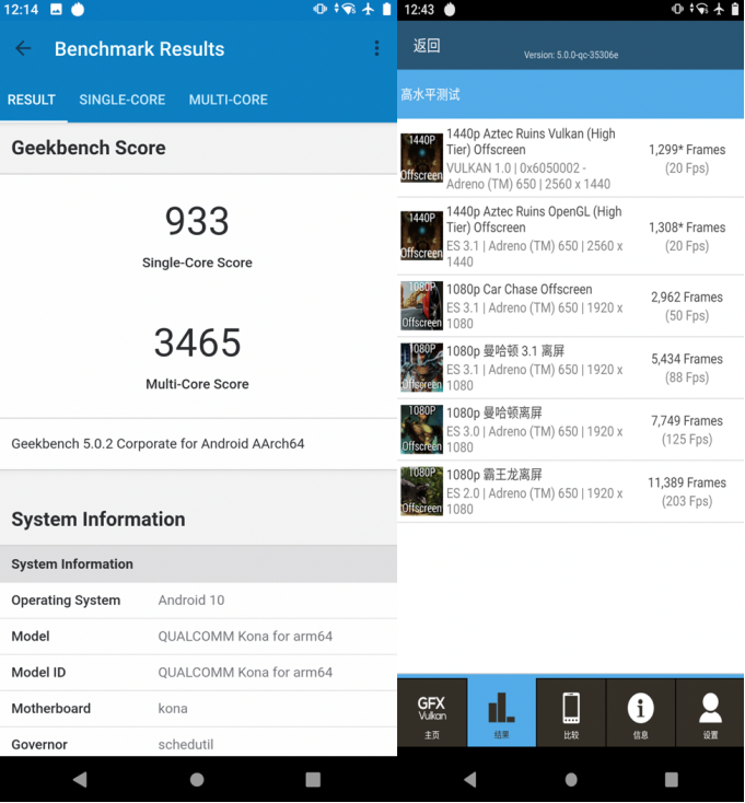 在Geekbench与GFXbench中,骁龙865的成绩也是很拔尖的。内核方面,骁龙865采用ARM公司最新的Cortex-A77架构,主频高达2.84GHz,此外还配备了3个频率为2.42GHz的A77中核,外加4个频率为1.8GHz的A55的小核,基本上这也是目前A77架构的主流搭配方式。