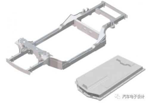 在福特的专利《US20190351750A1 Body-on-frame electric vehicle with battery pack integral to frame》描述了把电池集成到车体底板的办法,类似于之前 Benteler 的一体化底盘。