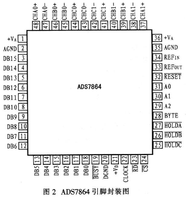 图1所示为ADS7864内部结构框图,该器件含有2个2μs的逐次逼近模数转换器、6个差分采样与保持放大器、1个带REFIN和REFOUT引脚的+2.5V内部电压基准以及1个高速并行接口。6个模拟输入通道分成3对(A、B、C)。每个A/D转换器都有3对输入端(A0/A1、B0/B1、C0/C1),可以同时采样、转换,因此可以保持两个模拟输入信号的相对相位信息。每对通道都有一个保持信号(HOLDA、HOLDB、HOLDC)使6个通道上的采样可同时进行。图2为ADS7864的引脚封装图,其引脚说明如表l所示。