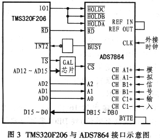 经过仔细分析,在电网谐波分析仪的硬件设计中F206与ADS7864仍然采用了传统的地址译码片选的接口方式,将F206的I/O空间选择端IS与地址线ADl2~ADl5先输入可编程逻辑器件GAL22V10,再输出片选信号CS。F206的RD端直接与ADS7864的读数据控制端RD端连接。