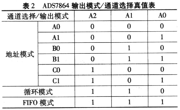 在转换完成时(BUSY信号变高),采样开关将关闭并且对选择的通道进行采样。延迟随后的转换,以便对ADS7864的输入电容完全充电。延迟时间取决于驱动放大器,但应该至少有175 ns。 (2)转换结果的读取 ADS7864有3种不同的数据输出模式,用A2、A1和A0引脚选择。如表2所列。