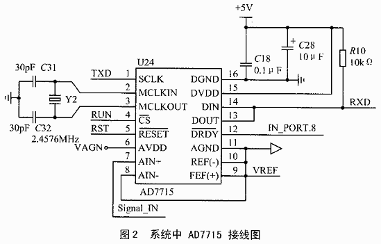 我们的系统使用12MHz主频的97C52,AD7715的接线如图2所示。