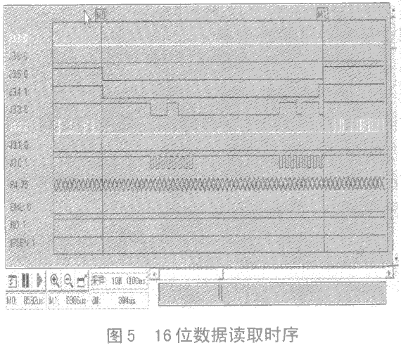 至于编程和调试,建议使用C语言,这已是潮流所趋。我们这个系统的工作方式类似于两个任务并发执行,每个通道最多一次要转换1800个数据供分析,用汇编来写程序是力不从心的。而对于AD7715的编程,一个好的调试工具是必须的,特别需要能观察时序的手段。图3~图5是逻辑分析仪采取的波形,分别是自校准时序、写命令时序和一次完整转换后读取16位结果的时序。