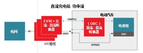 电池组有两条充电路径。第一条路径是电网直接连接到车辆内部的车载充电器(OBC)。此种 OBC 具有 AC/DC 和 DC/DC 功率转换单元,通常额定功率高达 6.6kW。在住宅和商业应用中,这些 OBC 能够在 8 到 17 个小时内为电池充电。第二条路径是使用单独的物理充电站。图 1 所示为充电站的系统架构。该路径由安装在车辆外部的用于连接电网和电池的一组 AC/DC 和 DC/DC 功率处理单元组成。这些转换器堆栈绕过 OBC 直接连接到电池。由于这些转换器未安装在车辆内部,因此可以设计成高功率电平,从而实现快速充电。