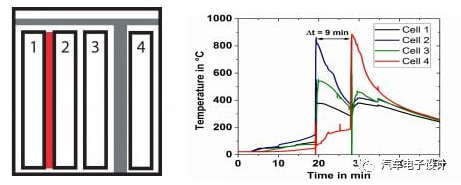 而另一个很重要的事情就是附近电芯的隔离,这里从热的角度来看,是在单个电芯持续发热和慢慢释放热量的过程中,另一个电芯从正面和极耳的温度能够坚持在被引燃的临界点之内。