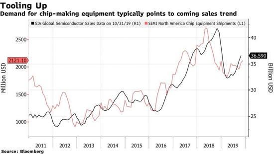 黑:SIA 全球半导体销量 (十亿美元) 红:SEMI 北美半导体设备出货 (百万美元) 图片:Bloomberg