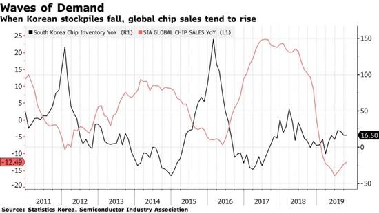 黑:韩国芯片库存年增率 红:SIA 全球芯片销量年增率 图片:Bloomberg
