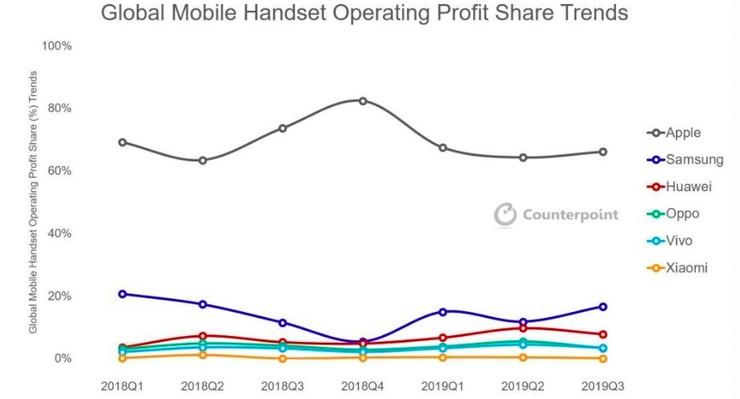 据研究机构Counterpoint周四发布的最新报告显示,在2019年Q3全球智能手机市场总利润为120亿美元,其中苹果独占66%的份额,蝉联利润冠军。