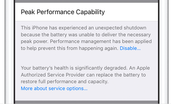 电池老化严重的的用户会在“设置”>“电池”>“电池运行状况”下看到以下警告: