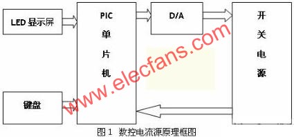 本设计采用开关电源,以达到输出范围和精度以及纹波的要求。根据系统要求,采用D/A转换后,接运算放大器构成的功率放大来控制D/A的输入,从而控制电流值的方法。本系统主要由数控部分、电源部分和键盘显示电路组成。系统原理框图如图1所示。