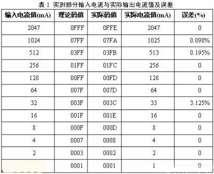 本设计要求输出电流范围为0.2A-1A,恒流源模块采样电阻两端电压为200mV-2000mV,由电压值可以推算出数模转换模块的参考电压|Vref|至少为2V(Vref<0)。本设计的Vref=-2.15V,输出端模拟电压范围为(0-12)V,所以输出电流为0.2A-1A。设计要求在0.2A-1A内任意预值,本设计通过键盘输入电流值送单片机,单片机根据输入的键值,将模拟量转换为数字量送给数模转换电路,然后输出模拟量。部分电流值及其对应的理论和实际的数字量如表1所列。其中对应理论码值为输入电流对应数模转换所需要的码值,实际码值为单片机根据输入电流值处理后送到数模转换器的码值。