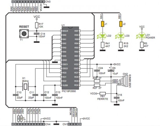 用于USB的PIC板的StartUSB电路图,其中两个LED连接到RA1和RB1