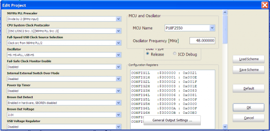 PIC18F2550板上的USB模块需要48.0 MHz的时钟才能全速运行。该时钟由内置96 MHz PLL模块通过将其输出除以2得到。PLL本身由来自主时钟源的4 MHz输入信号驱动,在本例中为8.0 MHz晶体。因此,可以通过使用PLL预分频器值2从8.0 MHz的源中获得驱动PLL所需的4.0 MHz。然后,将PLL(96 MHz)的输出除以2,以获得USB操作所需的48 MHz时钟。微控制器内核和其他外设也可以使用此时钟速度,但不是必须的。还有其他选项可以满足USB模块的时钟要求,并且仍然为从主振荡器源为其余器件提供时钟提供了灵活性。这些详细信息可在PIC18F2550的数据手册中找到。但是,对于用于PIC板的StartUSB,由于需要USB自举程序,USB模块和微控制器内核,两者都使用源自PLL的48.0 MHz时钟。不幸的是,引导加载程序不允许用户更改时钟设置,因此,它始终为48.0 MHz,除非您先擦除引导加载程序,然后使用外部编程器修改时钟设置的配置寄存器。因此,板载PIC18F2550单片机实际上以48.0 MHz而不是8.0 MHz运行。这就是LED闪烁快得多的原因。为了解决这个问题,请从mikroC的“项目”菜单中打开“编辑项目”窗口,并确保时钟设置与下面显示的匹配。