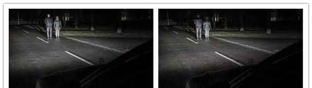 两边差别很明显,奔驰数字智能大灯能够精确调整灯光的亮度和照射范围,避免直射脸部的灯光。而普通灯光直接照在行人的脸上,会使人感到厌烦。