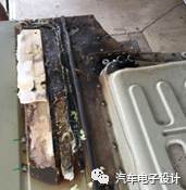 电池上部:除了一个模组上方的防火层(云母板)的区域被烧毁之外,整体的结构是完整的