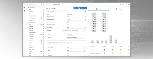 SysConfig是智能的。LaunchPad开发套件的主板视图显示了主板上使用的管脚以及图1所示的扩展接头。SysConfig了解应用程序已在使用哪些管脚和资源,且能够在启用和配置其他组件时帮助自动解决潜在冲突。例如,如果要在项目中添加一个模数转换器(ADC)实例,SysConfig将自动查找并分配下一个可用的ADC外设和管脚。使用加号标志可以轻松添加资源,下拉菜单则可帮助组织可用选项。颜色编码有助于指示冲突、共享资源和成功分配。