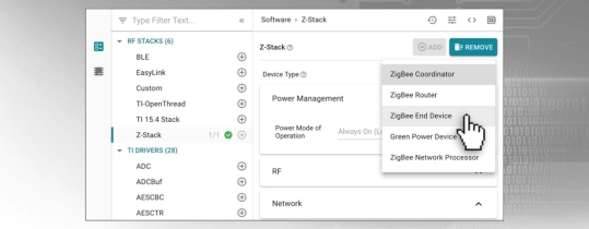 SysConfig的器件视图对于具有类似信息级别的自定义硬件开发很有用。软件视图(如图2中所示的Z-Stack配置视图)提供了可配置参数的总览,并显示每个参数的选项列表(在此示例中为Zigbee器件类型)。只需单击鼠标,即可将默认设置从Zigbee连接器更改为Zigbee终端器件。用鼠标悬停在“?”图标上,将显示有关这些参数的更多详细信息,而更新后的软件将显示在预览窗格中。在此初始版本中,SysConfig支持大多数SimpleLink™MCU的管脚和驱动器配置,包括射频(RF)参数和用于Wi-Fi®、以太网、Bluetooth®、Zigbee®、Thread、15.4和EasyLink的有线和无线通信技术的堆栈的配置。它还支持多协议配置。您可轻松更新默认设置,以快速找到适合您的用例的RF和堆栈设置的最佳组合。您还可将参数导出到其他TI工具,包括TI的Smart RF™Studio,以进行进一步的测试和调整。