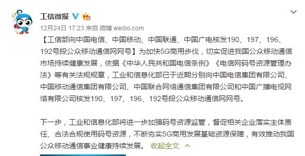 工信部24日消息,为加快5G商用步伐,已于近期分别向中国电信、中国移动、中国联通和中国广电核发190、197、196、192号段公众移动通信网网号。