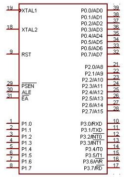 其以体积小、功能全、性价比等诸多优点而独具特色,在工业控制、尖端武器、通信设备、家用电器等嵌入式应用领域中独占鳌头。如果说C语言程序设计课程设计的基础课,那么单片机以其系统硬件构架完整、价格低廉、学生能动手等特点,成为工科学生硬件设计基础课。其管脚图如右图所示。