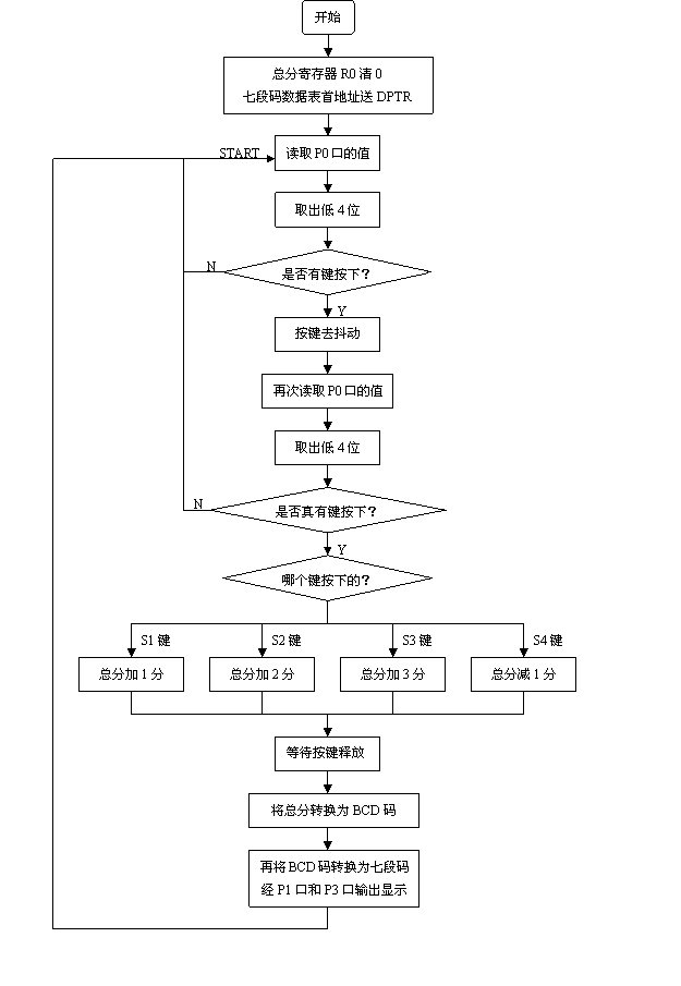 篮球比赛中,得分可分为1分、2分、3分三种情况,为防止出见加分错误要另设一减分开关。根据这样的设计要求,结合数码管的显示以及51单片机中计数器的工作实现方式、接口应用、中断控制等可设计出程序流程图如下所示: