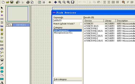 在生成*.HEX文件后,进入Protues软件,此时软件已自动打开一新建项目。我们可直接在其中构建电路图,点击板面左侧按键P,在弹出的Pick devices对话框中进行元器件的选择,如下图: