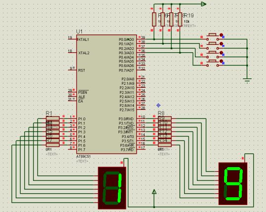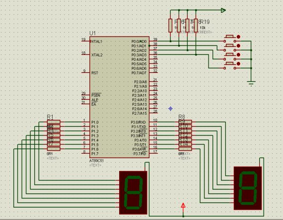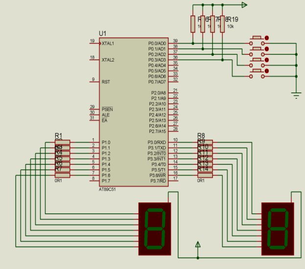采用数码管静态接法,P3口接数码管个位显示、P1口接数码管十位显示、P0口接四个开关,中间串接上电阻来作分压用,使得其高低电平能够清楚的分开从而可以实现开关上高低电平的跳变,使数码管工作。