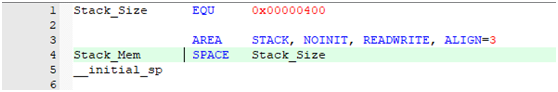 Stack_Mem SPACE Stack_Size,为Stack_Mem分配Stack_Size大小的一块内存区域,注意这里分配的是RAM,即分配了大小为1KB的内存空间(0x00000400 = 1024)。