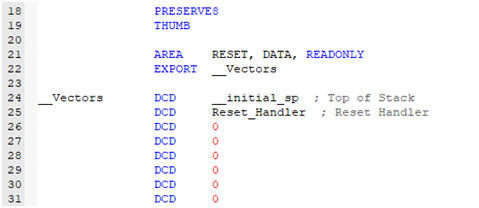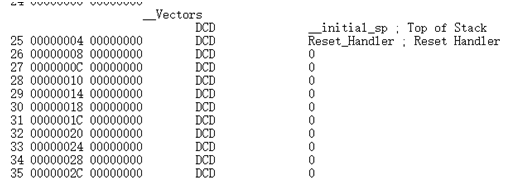 EXPORT __Vectors,导出向量表标号,EXPORT作用类似于C语言中的extern。之后的代码就是为向量表分配存储区域。中断向量表从FLASH的0x00000000地址开始放置,以4个字节为一个单位,地址0存放的是栈顶指针(sp)的地址,0x00000004存放的是复位程序的地址,往后以此类推,这里我们只设置了一个Reset_Handler向量。从代码上看,向量表中存放的都是中断服务函数的函数名,可我们知道C语言中的函数名就是一个地址。(由此我们知道,中断函数的函数名都已经知道了,我们在写对应的中断服务程序时,从对应的地址取服务例程的入口地址并跳入执行)。但是此处有一个要注意的,就是0号地址不是什么入口地址,而是给出的复位后的MSP的初值。