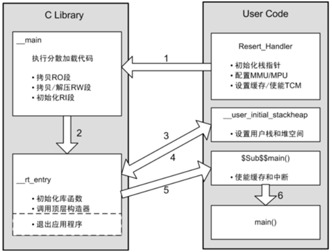 __main中的__scatterload负责设置内存,而__rt_entry负责设置运行时的环境。__scatterload中负责把RO/RW(非零)输出段从装载域地址复制到运行域地址(执行代码和数据复制、解压缩),并完成ZI段运行域数据的0初始化工作。然后跳到__rt_entry设置堆栈和堆、初始化库函数和静态数据。然后,__rt_entry跳转到应用程序的入口main()。主应用程序结束执行后,__rt_entry将库关闭,然后把控制权交换给调试器。函数标签main()具有特殊含义。Main()函数的存在强制链接器链接到__main和__rt_entry中的代码。如果没有标记为main()的函数,则没有链接到初始化序列,因而部分标准C库功能得不到支持。