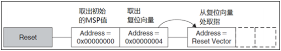 2、从地址 0x0000 0004 处取出 PC 的初始值,这个值是复位向量, LSB 必须是 1。 然后从这个值所对应的地址处取指。