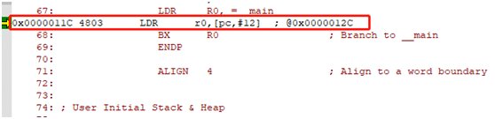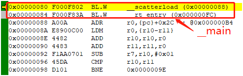 执行上两条指令,跳转到__main程序段运行,__main的地址是0x0000 0080,上一步指令pc = 0x0000 011D的地址没有对齐,硬件自动对齐到0x0000 011C,执行__main。