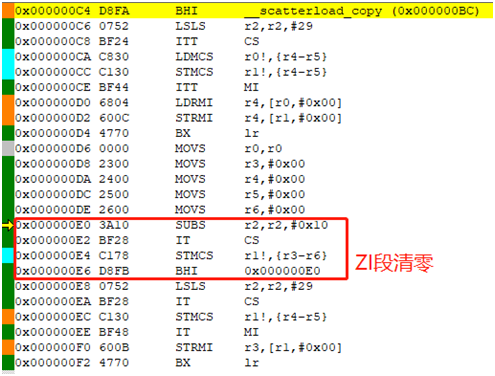 在__scatterload函数中又会进入__scatterload_copy,在__scatterload_copy中进行代码搬运,主要是加载已经初始化的数据段和未初始化的数据段,同时还会初始化栈空间,即ZI段清零(其中搬运次数由代码中声明的变量类型和变量多少来决定)。