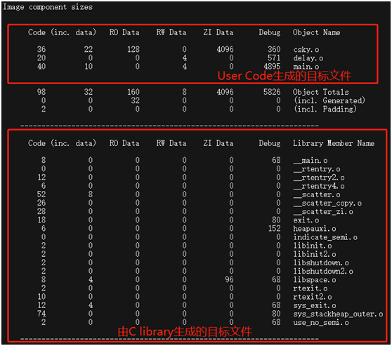 上图即是armlink的链接器为测试代码生成的xxx.map文件中的一部分,其描述了镜像文件的组成信息,其中可以明显看到其由两部分构成: