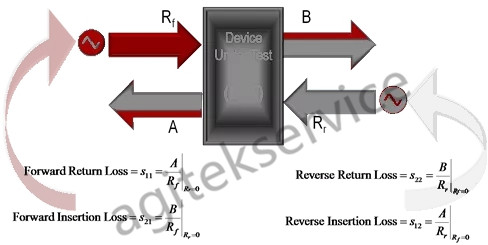 网络分析仪的基本结构绝大部分在测试装置中实现。一旦分析仪测量出入射信号(R参考接收器)和传输信号的幅值和相位,或者是反射信号(A和B接收器)的幅值和相位,就可计算出四个S-参数值,如图所示。