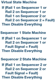 例如,设计人员在时序控制器1上监测两条电压轨,在时序控制器2上也监测两条电压轨。该设计要求,如果这四条电压轨中的任何一条出现故障,那么所有一切都将关闭。实际上,因为这里有两个设备,它们之间必须共享故障信号。系统的虚拟状态机和各个设备的状态机如图4所示。