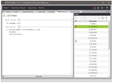 随着电压轨数量增加,定序需求变得愈加复杂,系统级虚拟状态机和设备级状态机的差异也越来越大。设计人员知道自己的设计目标,但必须通过时序控制器协同工作来实现,这个过程不但耗时,且通常漏洞很多。ADI Power Studio让大部分状态机创建流程实现了自动化。用户使用GUI来设计虚拟状态机,而ADI Power Studio则通过编译器来处理各种时序控制器之间的复杂通信。这让设计人员能够通过灵活、直观的流程创建复杂的状态机。