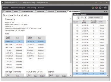 ADI Power Studio和ADM1266配有软件设计环境中常见的高级调试工具,可以简化调试过程。第一个调试工具以断点的形式出现,在特定状态下,时序会停止前进。在采用多个ADM1266器件的系统中,所有ADM1266器件都将通过状态机进行转换,在到达包含用户定义的断点的状态时停止。这种时序暂停让设计人员能够调试出现故障的电压轨,或者确认信号的逻辑电平错误的原因。