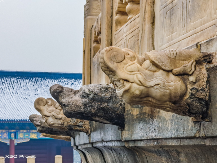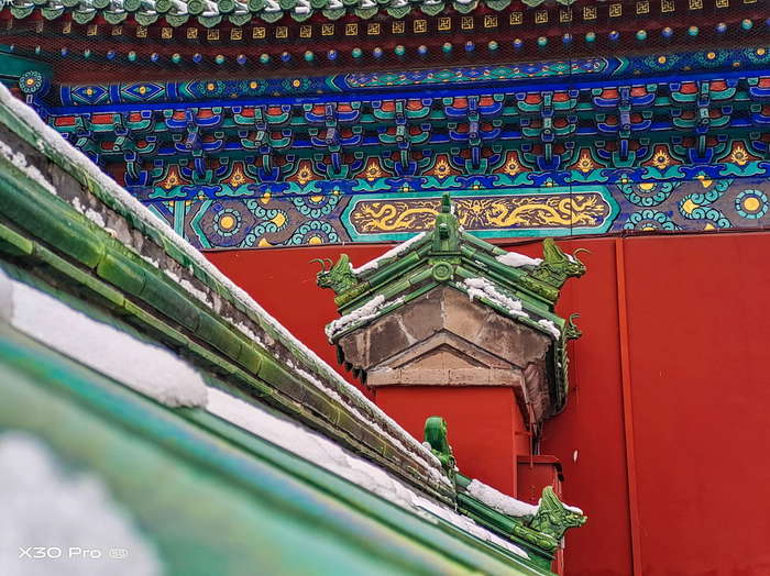 想要记录天坛建筑屋檐上精美的细节,亦或是那瓦片上的白雪,只需利用vivo X30 Pro可以高达60倍的变焦功能,就可轻松记录以往手机难以捕捉的长焦画面。而由于透视原理,简单来说就是长焦的镜头更容易形成虚化的背景。这张图远处的皇穹宇细节更显张力,近处宫门成为了衬托皇穹宇的存在,画面充满层次感。