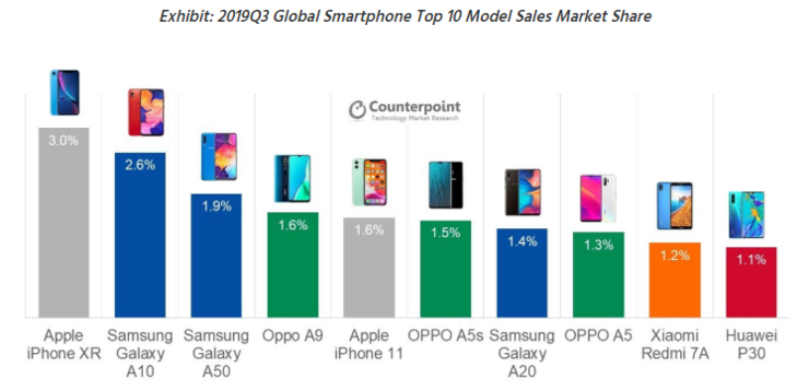 我们简单看一下 2019 年 Q3 全球最畅销的十款智能手机的具体情况: