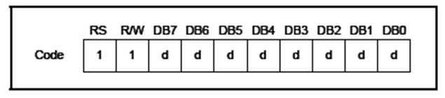 说明:RS=1,数据;RW=1,读。先设置好CGRAM或DDRAM的地址,然后执行读取命令。数据就被读入后DB7—DB0。