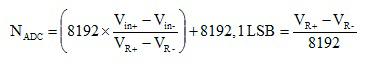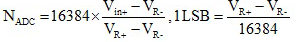 ADC核心将模拟输入转换为其14位数字表示。核心使用两个可编程电压级别(VR+和VR -)来定义转换的上限和下限。当输入信号等于或大于VR+时,数字输出(NADC)为全尺度(3FFFh),当输入信号等于或小于VR -时为零。输入通道和参考电压电平